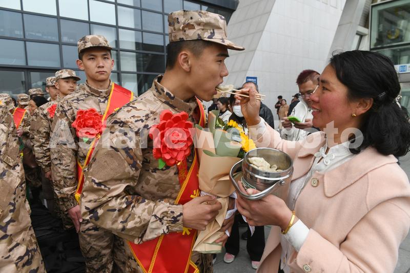 图片说明:2024年3月18日,在安徽省阜阳市2024年上半年新兵起运仪式现场,新兵郝行善吃上妈妈亲手包的饺子。