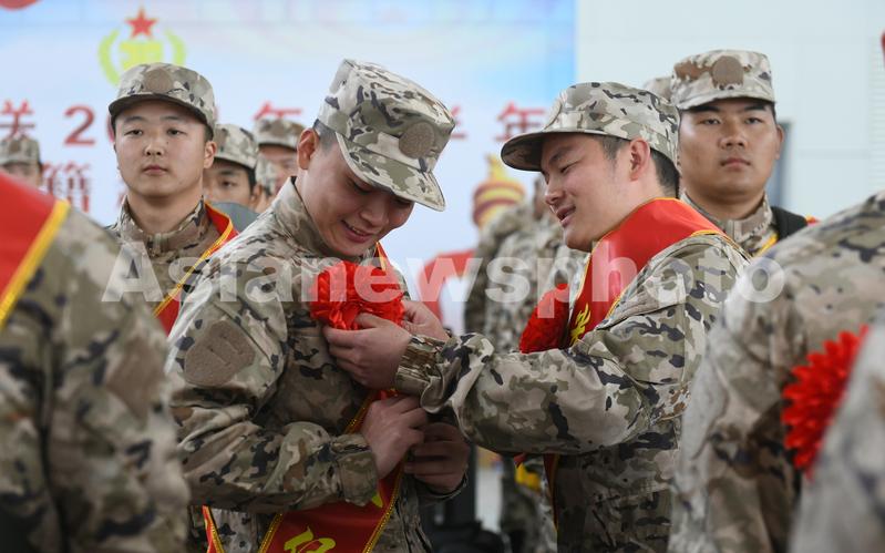 图片说明:2024年3月18日,安徽省阜阳市,走进高铁阜阳西站乘车的新兵相互帮忙佩戴大红花。