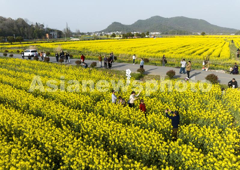 图片说明:2024年3月19日,安徽省芜湖市三山经济开发区峨桥镇,游客在响水涧油菜花海里游玩赏花。