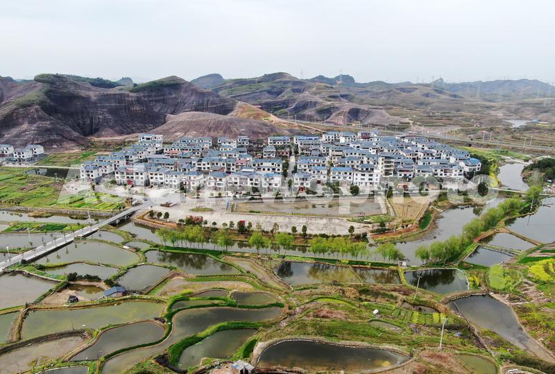 2024年3月21日,湖南省资兴市唐洞街道大王寨村一幢幢蓝顶白墙的新房与丹霞地貌、田园、鱼塘、公路互相依衬,构成一幅美丽的乡村春日图景。