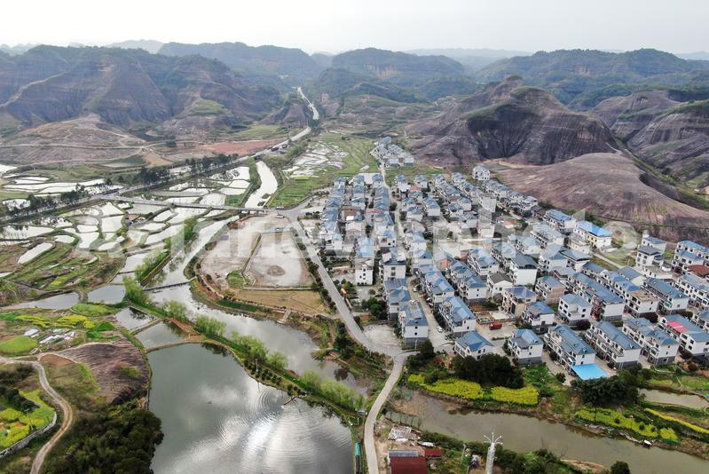 2024年3月21日,湖南省资兴市唐洞街道大王寨村一幢幢蓝顶白墙的新房与丹霞地貌、田园、鱼塘、公路互相依衬,构成一幅美丽的乡村春日图景。