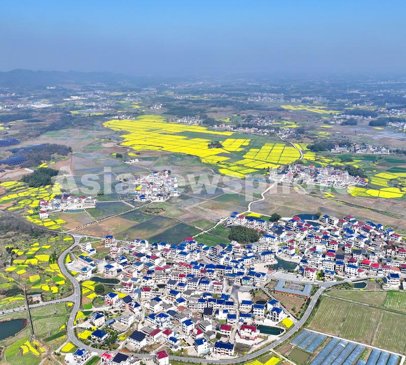 2024年3月20日,江西省九江市湖口县武山镇王常村一带,乡村大地阡陌纵横,屋舍小楼错落有致,道路畅通、风景优美,宛如一幅春日田园生态画卷映入眼帘。