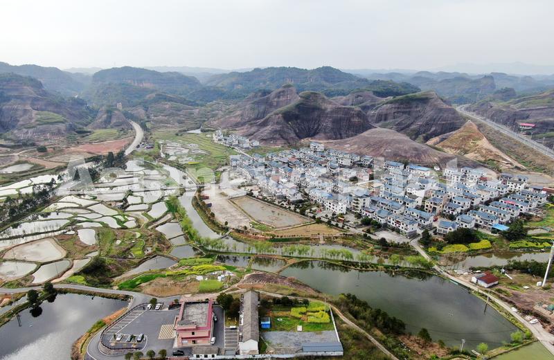 2024年3月21日,湖南省资兴市唐洞街道大王寨村一幢幢蓝顶白墙的新房与丹霞地貌、田园、鱼塘、公路互相依衬,构成一幅美丽的乡村春日图景。