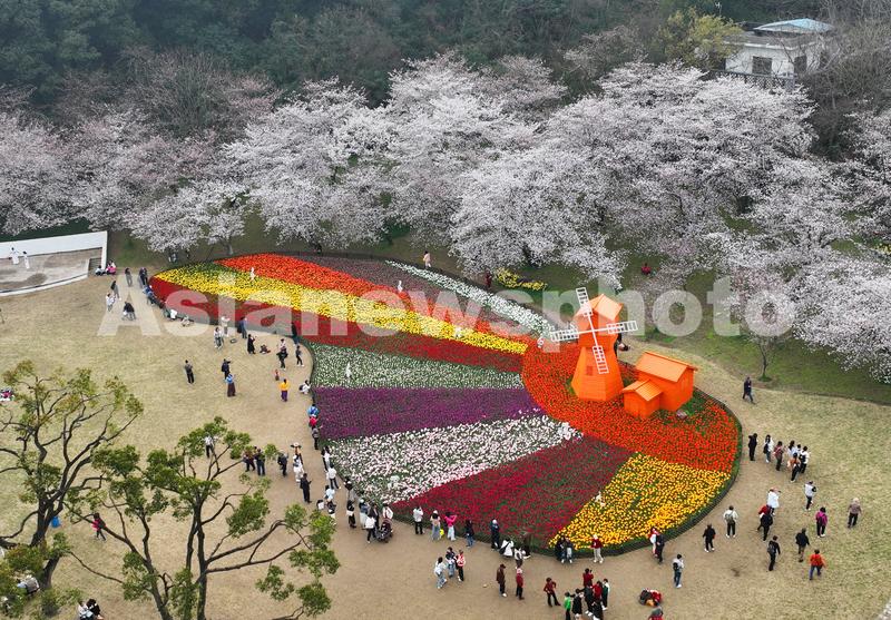 图片说明:3月25日,游人在樱花与郁金香辉映的苏州市上方山国家森林公园春游赏花。