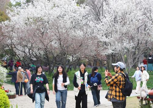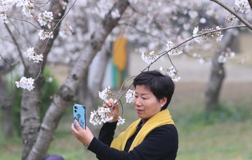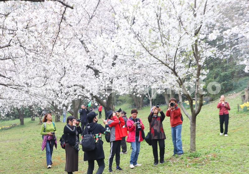 图片说明:3月25日,一群摄影爱好者在苏州市上方山国家森林公园樱花林间赏花拍照。