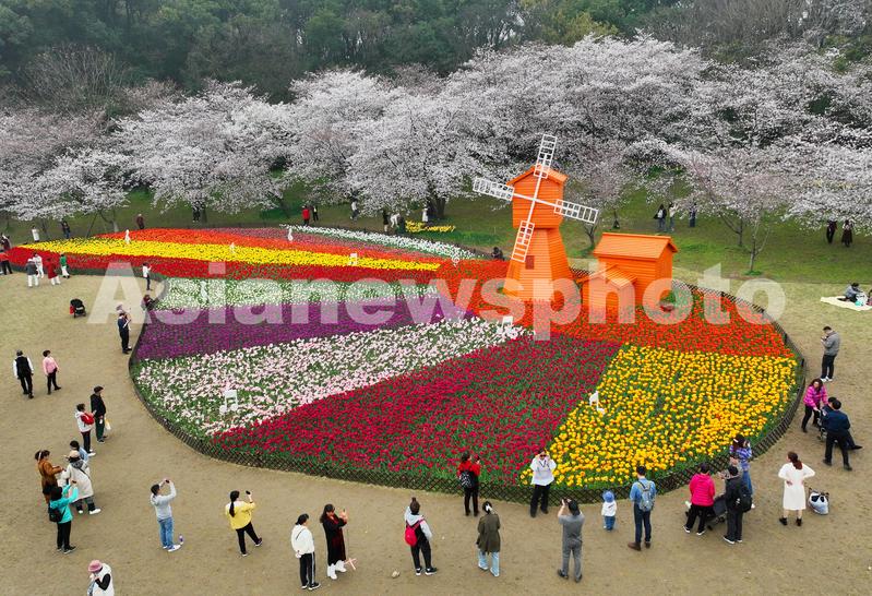 图片说明:3月25日,游人在樱花与郁金香辉映的苏州市上方山国家森林公园春游赏花。