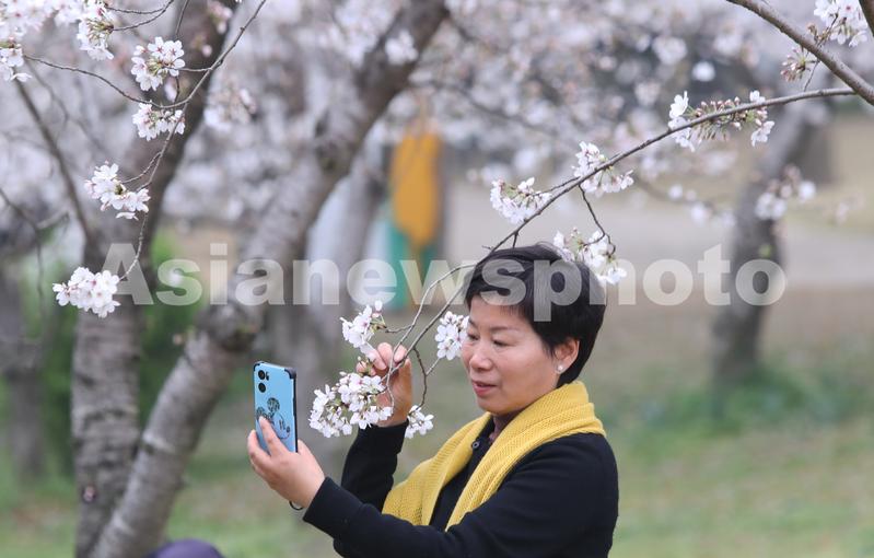 图片说明:3月25日,一名游客在苏州上方山国家森林公园绽放的樱花林用手机自拍。