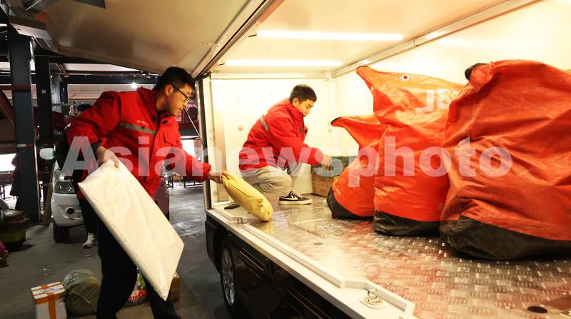 图片说明:2024年3月28日,连云港市公共配送中心,工作人员正在将快递包裹装上无人驾驶快递车。