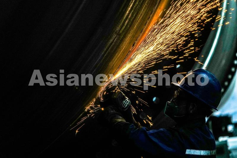 3月28日,在广西柳州恒嘉塔筒制造有限公司融安风机塔筒厂生产车间,工人在对风机塔筒的焊接点进行打磨作业。
