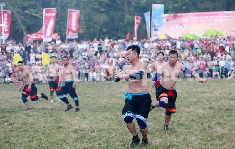 图片说明:2024年3月28日,在广西壮族自治区崇左市江州区左州镇举办的2024年金山花炮节系列活动中,当地群众参加抢花炮比赛。
