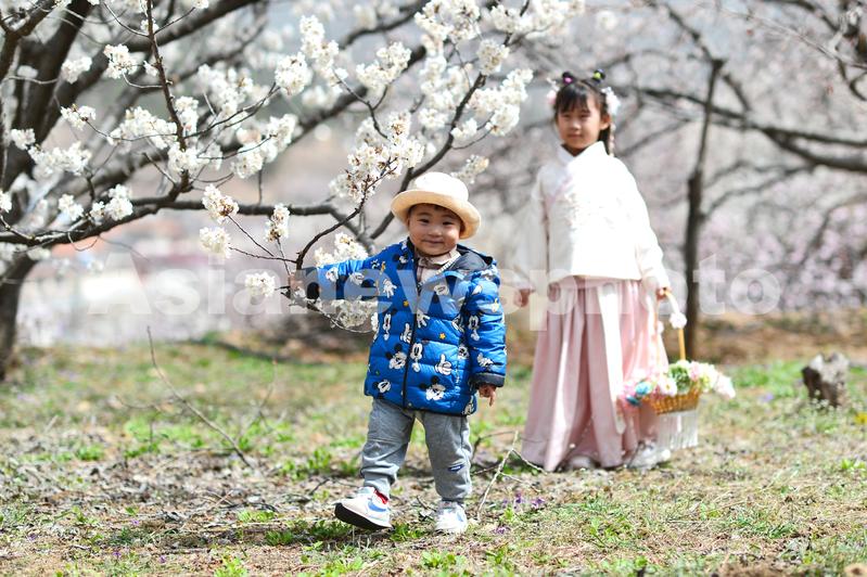 2024年3月29日,在山东省青岛市城阳区夏庄街道山色峪樱桃园,两名小朋友在踏青游玩。