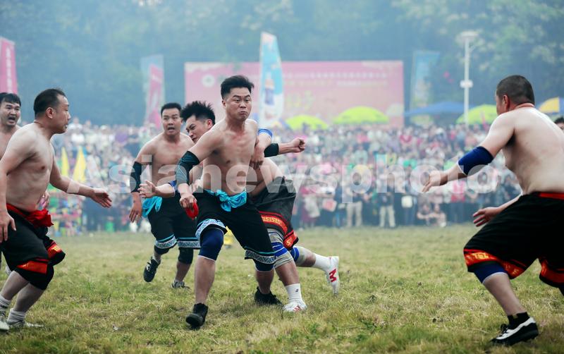 图片说明:2024年3月28日,在广西壮族自治区崇左市江州区左州镇举办的2024年金山花炮节系列活动中,当地群众参加抢花炮比赛。