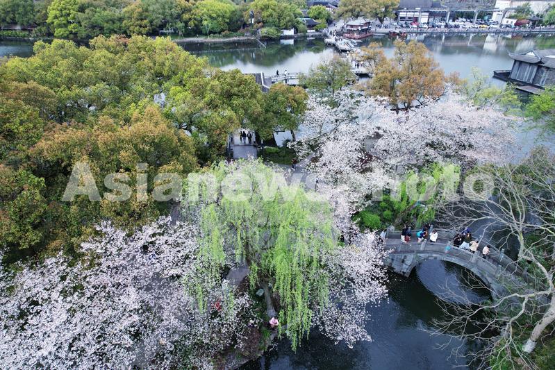 2024年3月28日,游客乘坐游船观赏在杭州西湖景区盛开的樱花。 近日,杭州西湖景区樱花盛开,吸引不少市民和游客前来踏青赏樱,乐享春光。