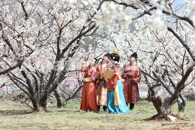 2024年3月29日,山东省青岛市城阳区夏庄街道山色峪的3千亩樱桃花盛开,游客在体验唐时踏青郊游的意境。