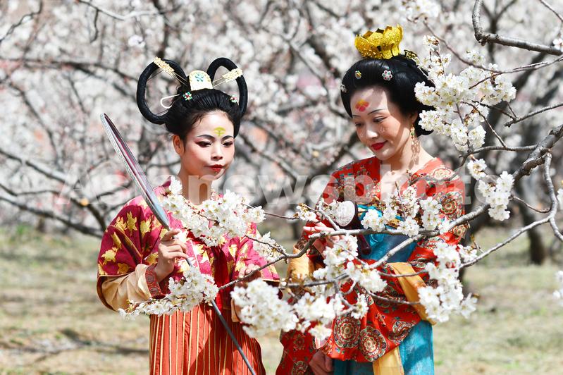 2024年3月29日,山东省青岛市城阳区夏庄街道山色峪的3千亩樱桃花盛开,游客在体验唐时踏青郊游的意境。