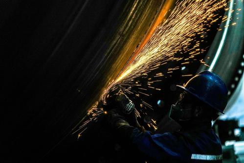 2024年3月28日,在广西柳州恒嘉塔筒制造有限公司融安风机塔筒厂生产车间,工人在对风机塔筒的焊接点进行打磨作业。