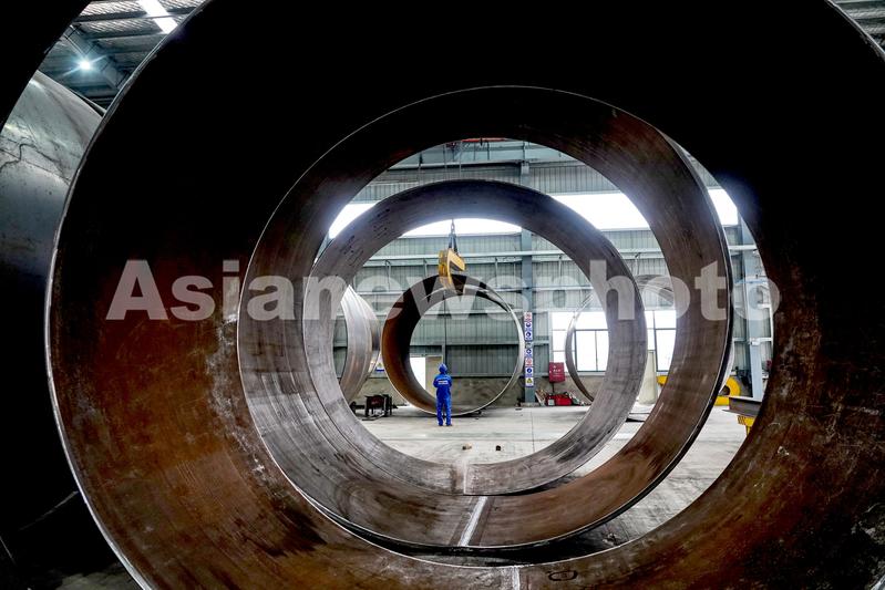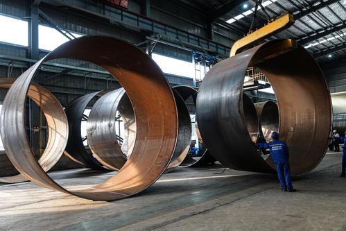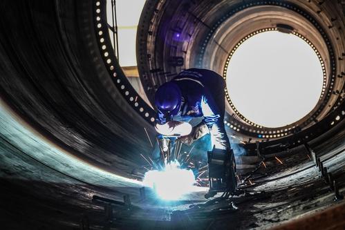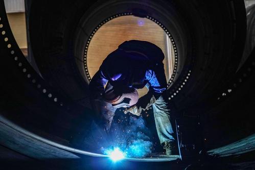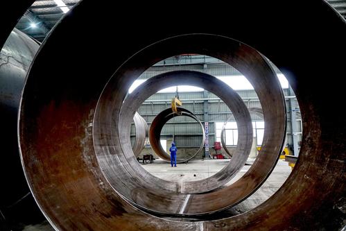 3月28日,工人在广西柳州恒嘉塔筒制造有限公司融安风机塔筒厂生产车间作业。