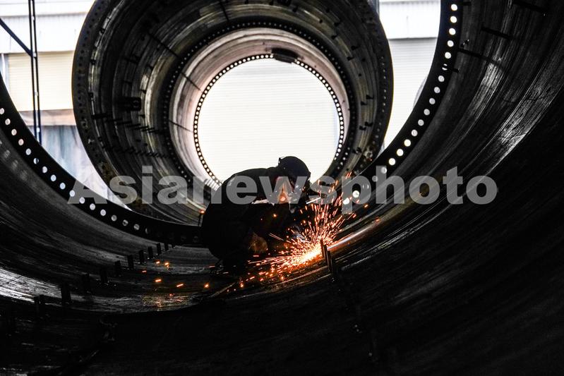 2024年3月28日,在广西柳州恒嘉塔筒制造有限公司融安风机塔筒厂生产车间,工人在对风机塔筒的焊接点进行打磨作业。