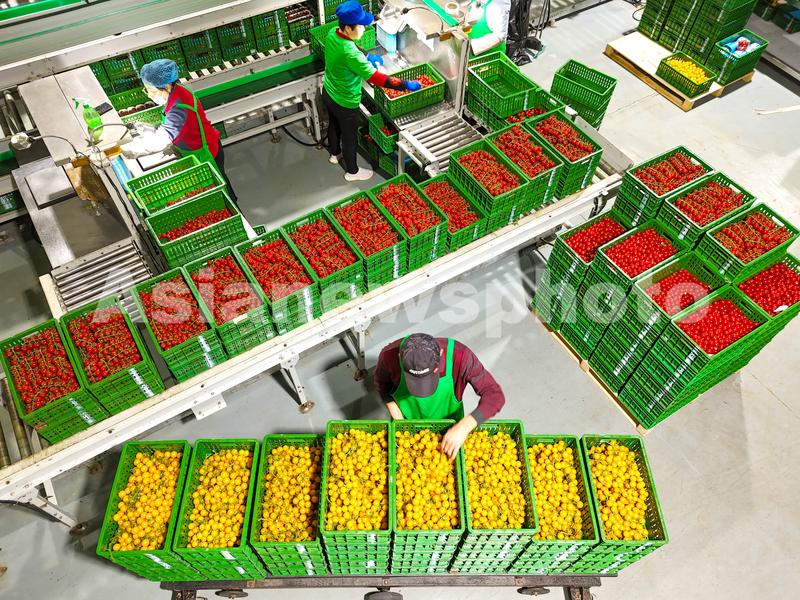 图片说明:3月31日,在山东莱西市一家智慧农业产业园,工人在对果品进行分拣包装。