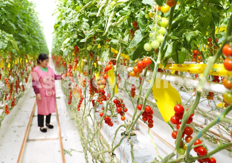 图片说明:3月31日,在山东莱西市一家智慧农业产业园,工人在察看番茄的生长情况。