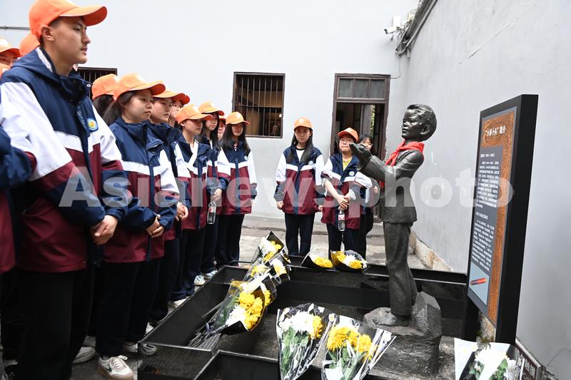 图片说明:2024年4月1日,在位于重庆市沙坪坝区的白公馆,学生在中国最小的烈士宋振中(小萝卜头)雕像处,缅怀英烈。
