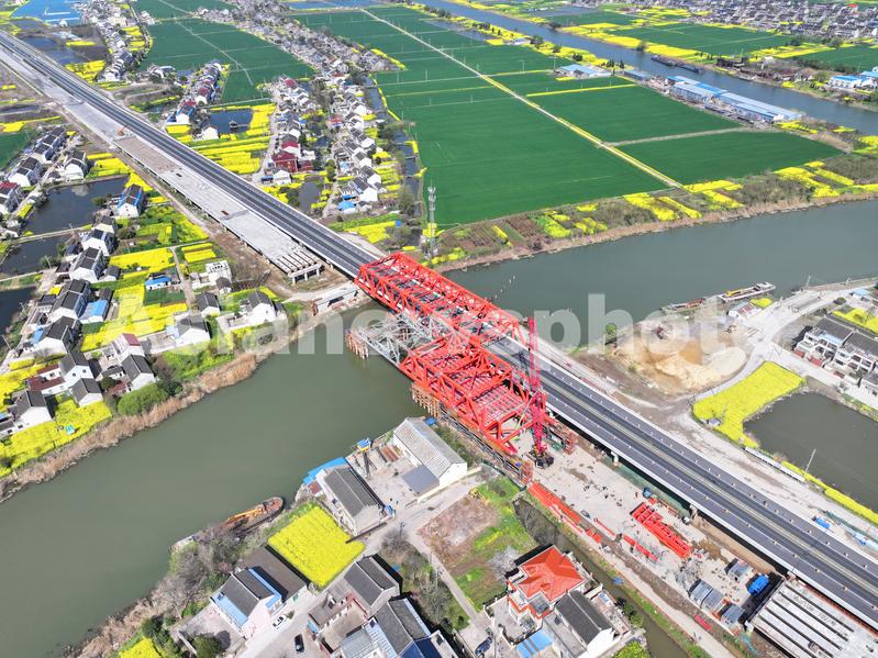 2024年3月29日拍摄的沪陕高速公路平潮至广陵段扩建工程夏仕港大桥施工现场。