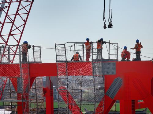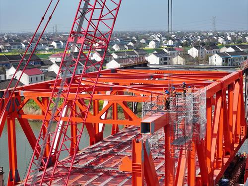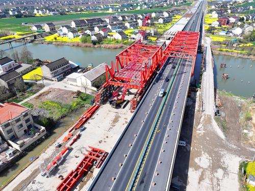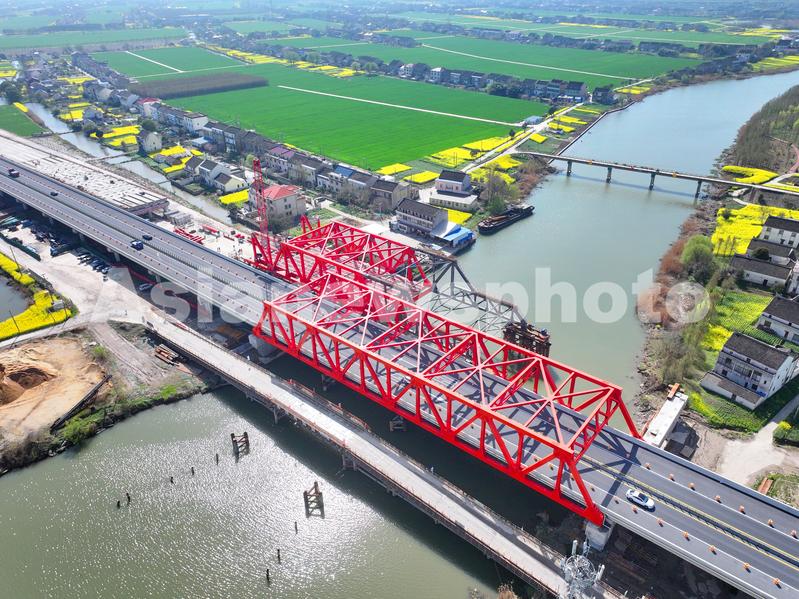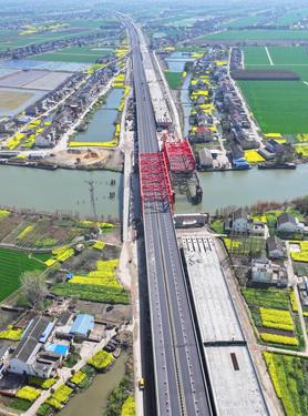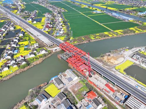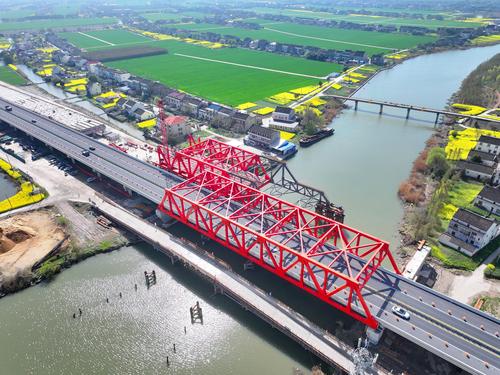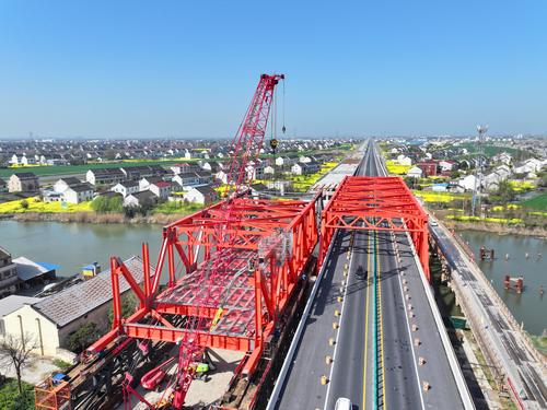 2024年3月29日拍摄的沪陕高速公路平潮至广陵段扩建工程夏仕港大桥施工现场。目前夏仕港大桥正有序推进主桥钢桁梁第四节段拼装和引桥桥面施工,大桥全长820米,建成后将由原先的双向四车道扩建为双向八车道,最高时速由100公里提升至120公里。