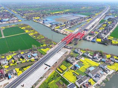 2024年3月29日拍摄的沪陕高速公路平潮至广陵段扩建工程夏仕港大桥施工现场。