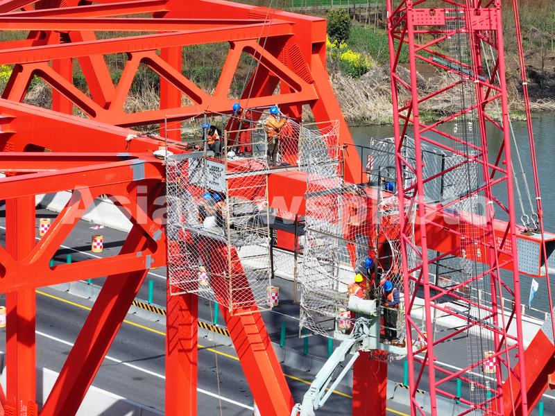 2024年3月29日拍摄的沪陕高速公路平潮至广陵段扩建工程夏仕港大桥施工现场。目前夏仕港大桥正有序推进主桥钢桁梁第四节段拼装和引桥桥面施工,大桥全长820米,建成后将由原先的双向四车道扩建为双向八车道,最高时速由100公里提升至120公里。