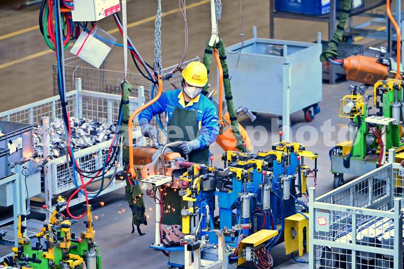 图片说明:2024年4月2日,江西省南昌市南昌县的一家汽车生产企业自动化车间内,工人在主焊线上焊装车厢架。