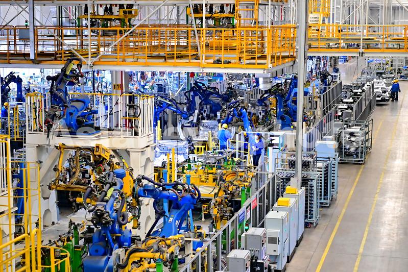 图片说明:2024年4月2日,江西省南昌市南昌县的一家汽车生产企业自动化车间内,生产线上快速运转的智能设备在焊装车厢架。