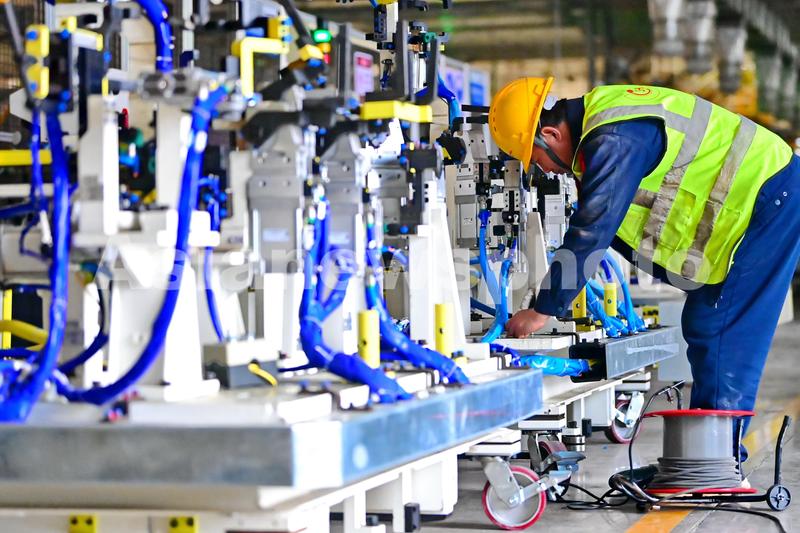 图片说明:2024年4月2日,江西省南昌市南昌县的一家汽车生产企业自动化车间内,工人在主焊线上焊装车厢架。