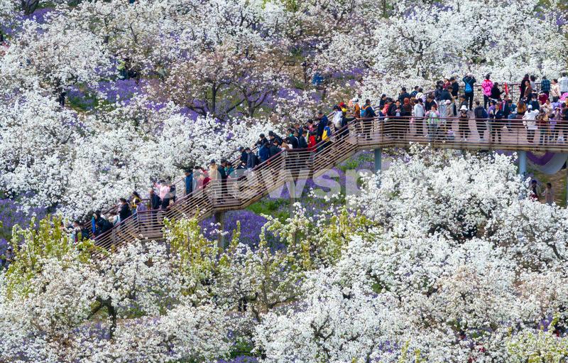 图片说明:2024年4月4日,游客在江苏省宿迁市三台山森林公园“梨兰会”景区内赏花游玩。