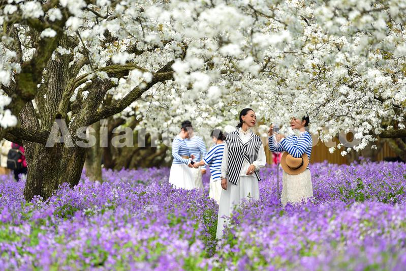图片说明:2024年4月4日,游客在江苏省宿迁市三台山森林公园“梨兰会”景区内赏花游玩。