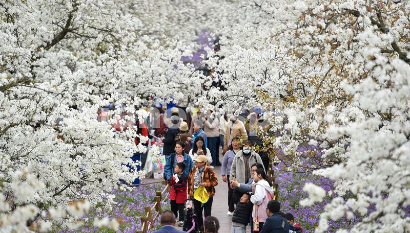 图片说明:2024年4月4日,游客在江苏省宿迁市三台山森林公园“梨兰会”景区内赏花游玩。
