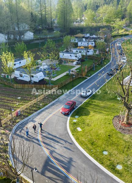 图片说明:2024年4月5日,游客在安徽省芜湖市繁昌区孙村镇中分村途居马仁山房车露营地游玩。
