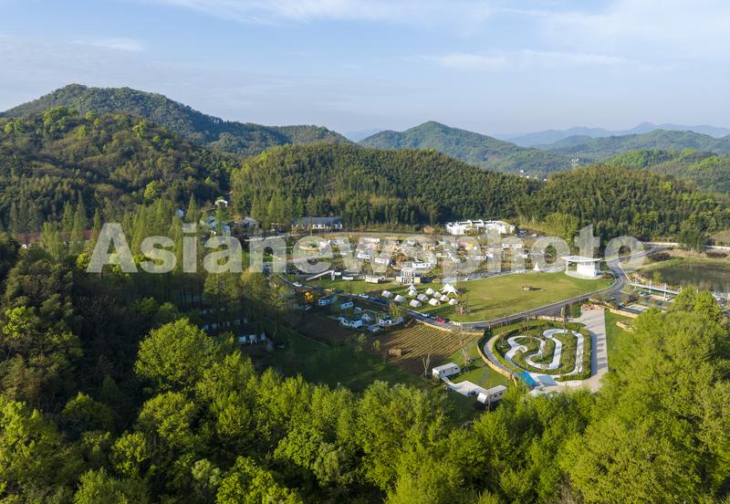 图片说明:2024年4月5日,在安徽省芜湖市繁昌区孙村镇中分村途居马仁山房车露营地,数十辆房车错落有致分布在山林竹海间。