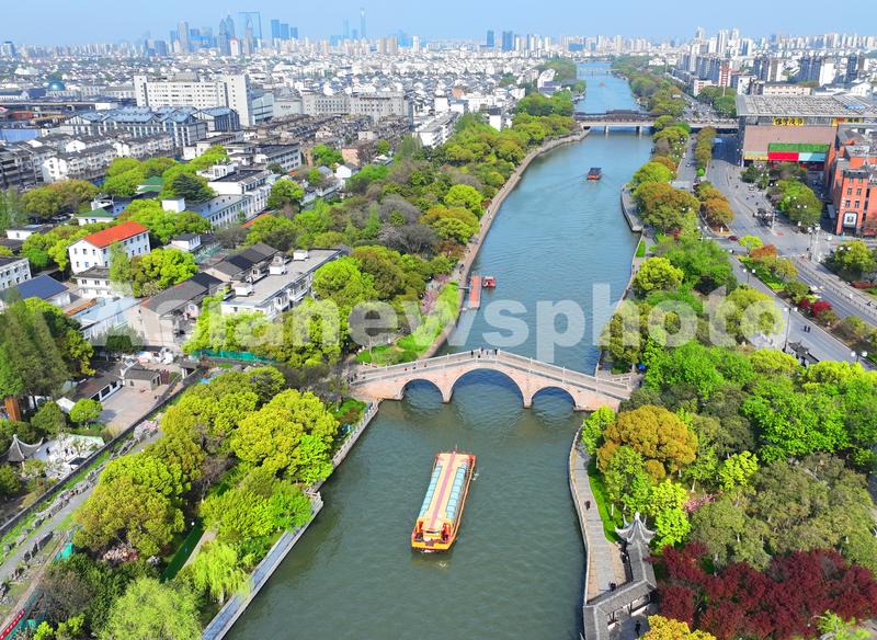 图片说明:4月5日,苏州古运河畔碧水蓝天与绿色生态春美如画景色(无人机照片)。