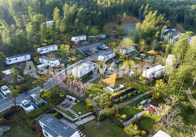 图片说明:2024年4月5日,在安徽省芜湖市繁昌区孙村镇中分村途居马仁山房车露营地,数十辆房车错落有致分布在山林竹海间。