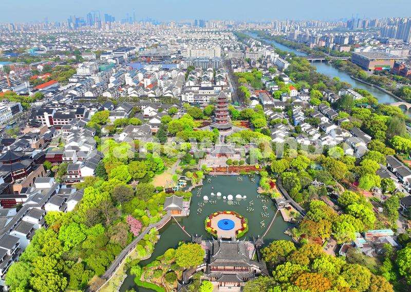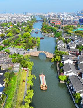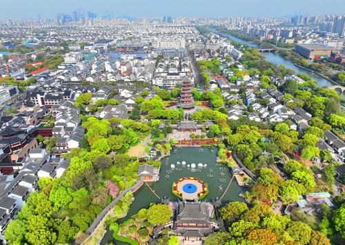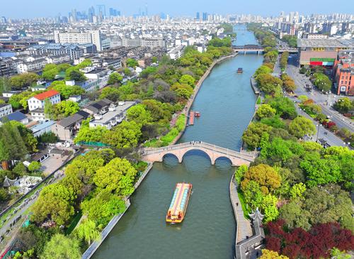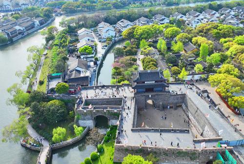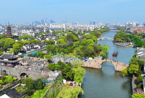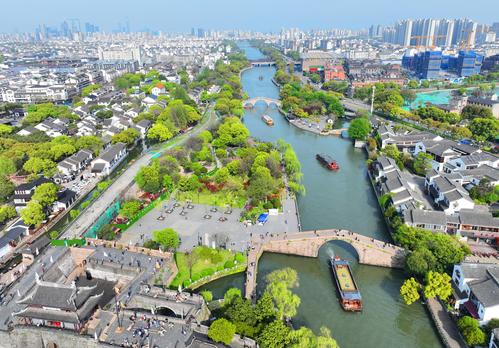 图片说明:4月5日,苏州古运河盘门段碧水蓝天与绿色生态如画美景(无人机照片)。