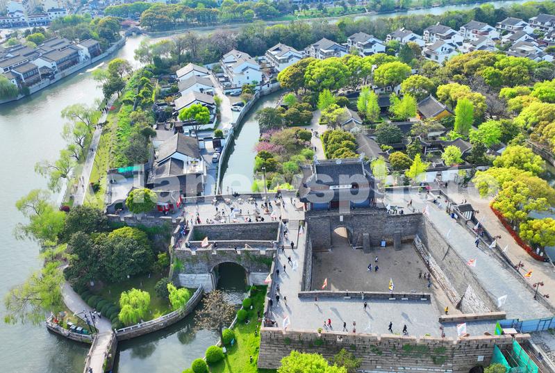 图片说明:4月5日,人们在春光明媚的苏州古运河盘门瓮城观光游览(无人机照片)。
