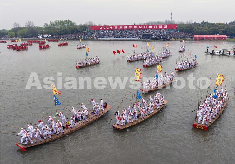 2024年4月6日,,2024年泰州姜堰溱潼会船在江苏省泰州市姜堰区溱湖国家湿地公园开幕,五百多条各式各样的船只和上万名会船选手飞篙走桨,弄潮击浪,演绎历久弥新的民俗画卷。