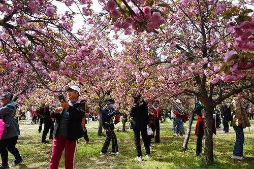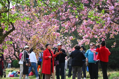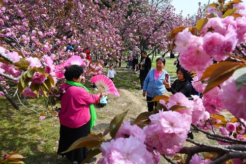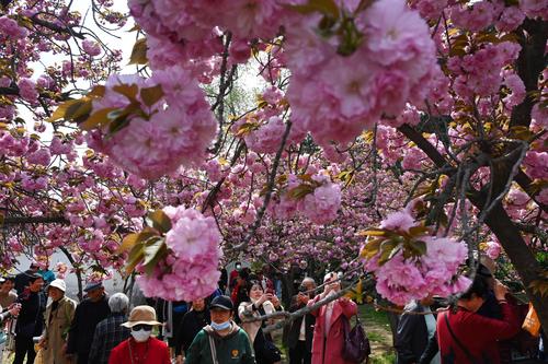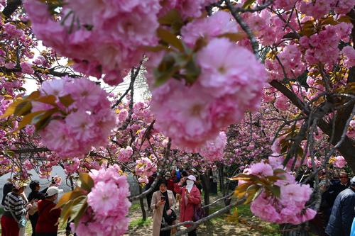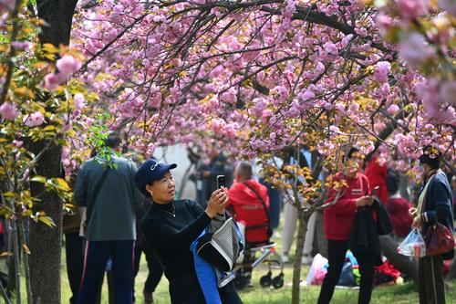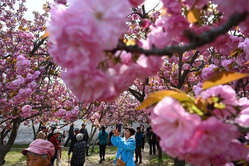 图片说明:4月7日,游客在河南省开封市禹王台公园内观赏樱花或拍照留念。