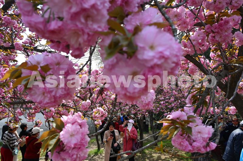 图片说明:4月7日,游客在河南省开封市禹王台公园内观赏樱花或拍照留念。
