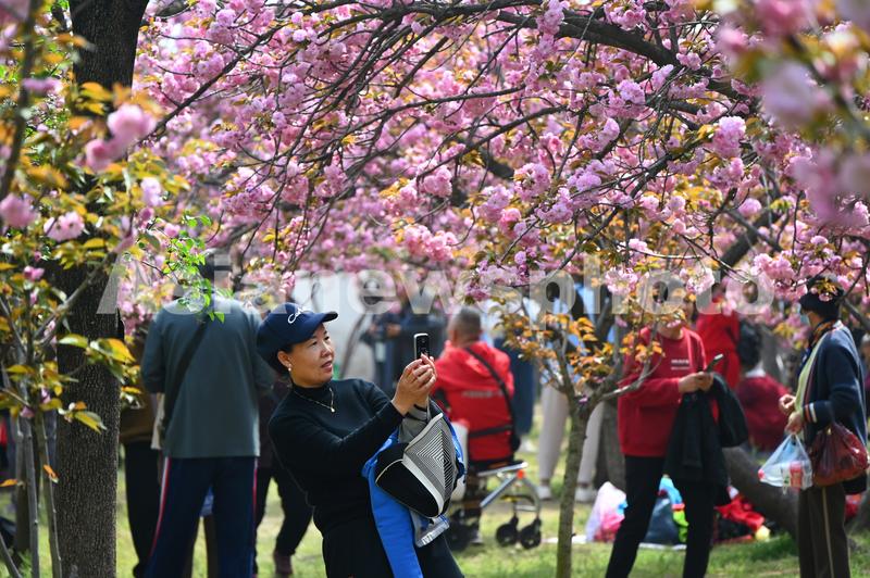 图片说明:4月7日,游客在河南省开封市禹王台公园内观赏樱花或拍照留念。