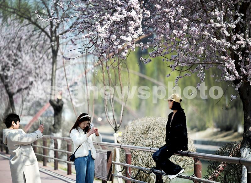 2024年4月8日,沈阳市民在卫工明渠旁桃花盛开处打卡拍照,留住春天美好景象。