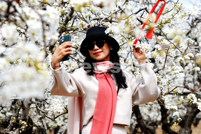图片说明:2024年4月8日,山东青岛西海岸新区石梁刘村,游客在观赏盛开的梨花。
