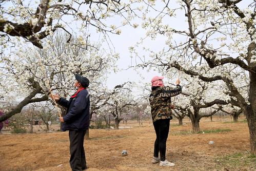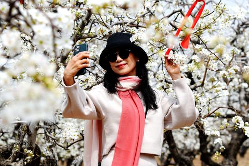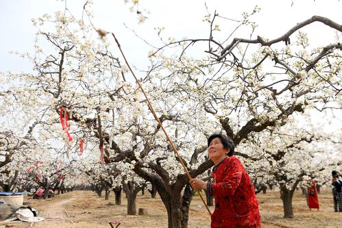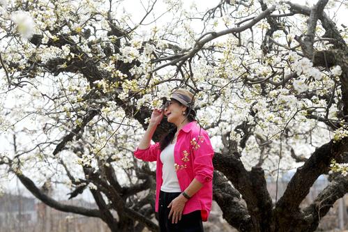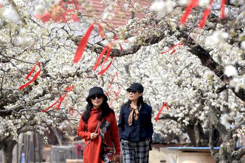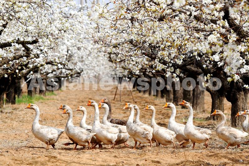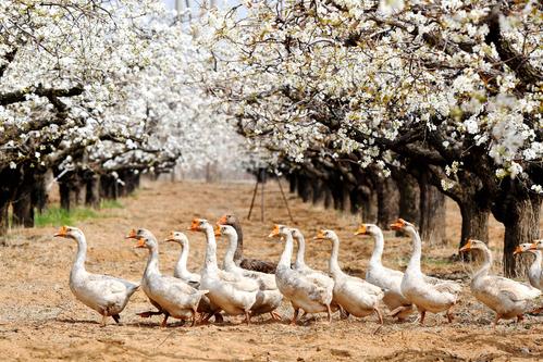 图片说明:2024年4月8日,山东青岛西海岸新区石梁刘村,鹅群从盛开鲜花的梨树下走过。