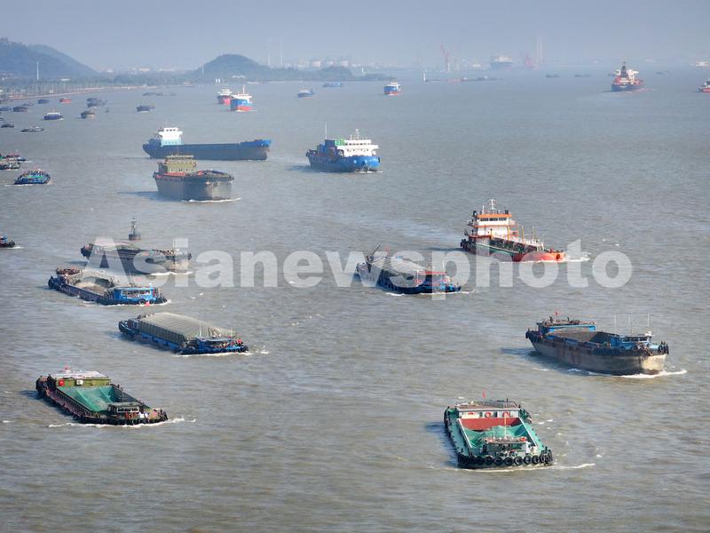 2024年4月10日在长江江苏南通段拍摄的江面上众多航行的货运船舶。