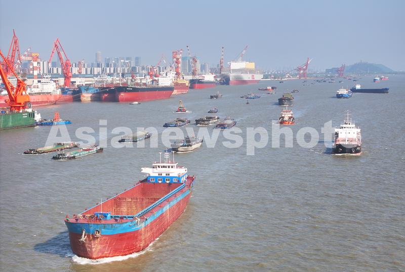 2024年4月10日在长江江苏南通段拍摄的江面上众多航行的货运船舶。